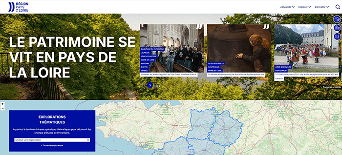 Je découvre le patrimoine culturel des Pays de la Loire en ligne : photothèque, visites et expositions, podcasts, vidéos témoignages, publications, open data, ressources cartographiques, centre de ressources et bibliothèque du patrimoine...