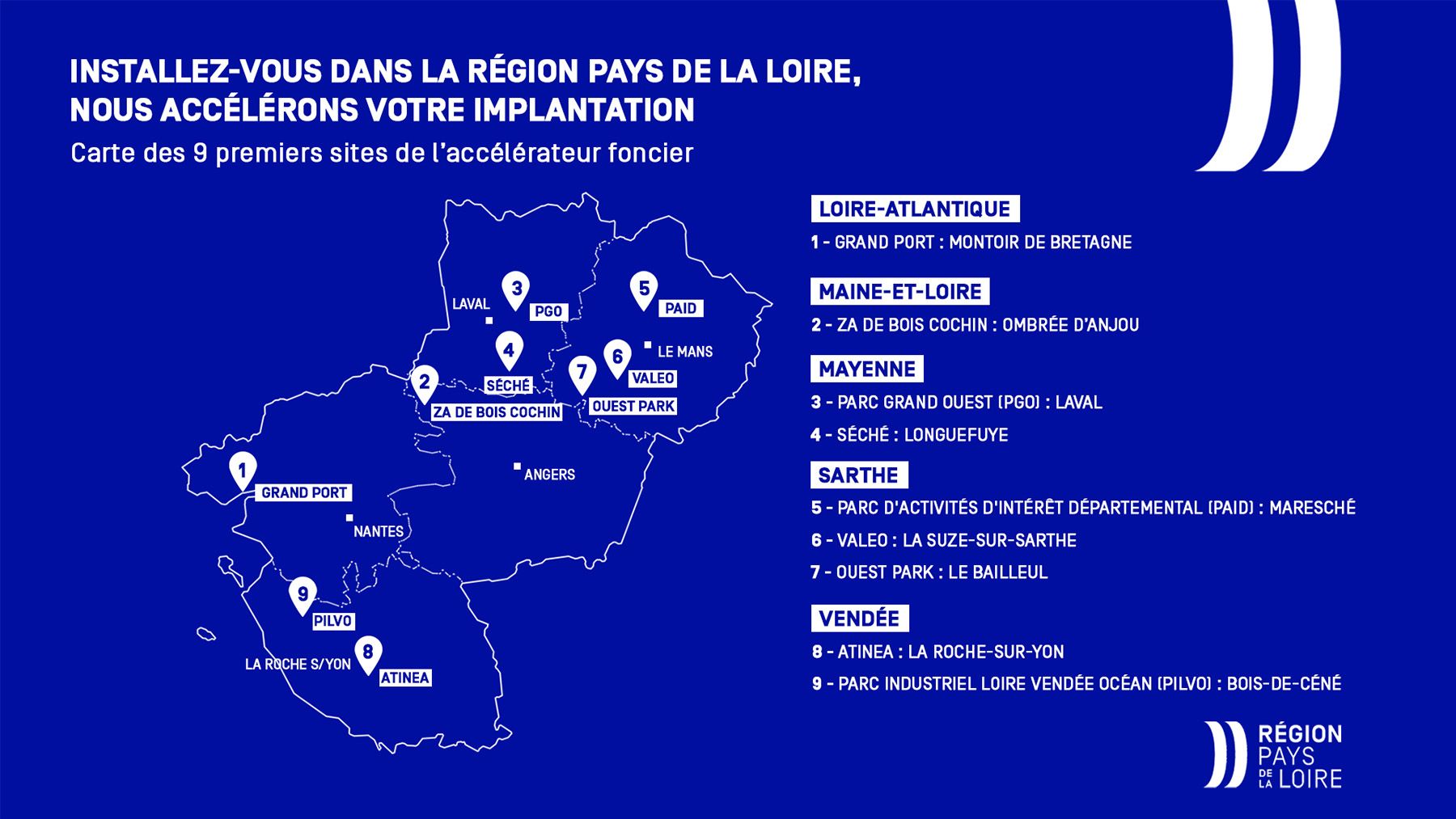La Région des Pays de la Loire, avec le Préfet de région et les intercommunalités, a identifié 9 sites stratégiques immédiatement mobilisables pour vos projets d’implantation ou d’extension industrielle. Répartis dans les cinq départements, ils offrent de grandes surfaces disponibles :