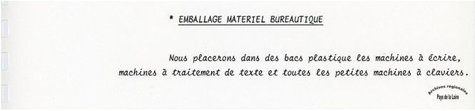 Révélateur du travail administratif de l’époque, les informations relatives au déménagement du matériel bureautique nous font découvrir une administration en cours d’informatisation : voir ci-contre le paragraphe relatif au matériel bureautique dans l’offre du prestataire retenu… Un peu plus loin le paragraphe consacré aux équipement lourds indique une unité centrale informatique (au singulier), signe du début d’informatisation des activités.