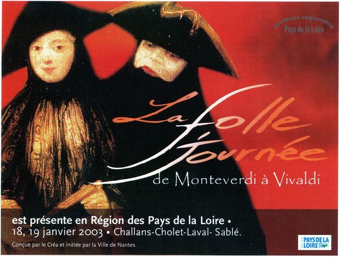 La Région assure le lien entre le CREA et les villes partenaires, ainsi que la communication et la billetterie. Cette première édition de la Folle Journée en région propose un parcours dans l’Italie baroque des 16e et 17e siècles « De Monteverdi à Vivaldi », les 18 et 19 janvier 2003.