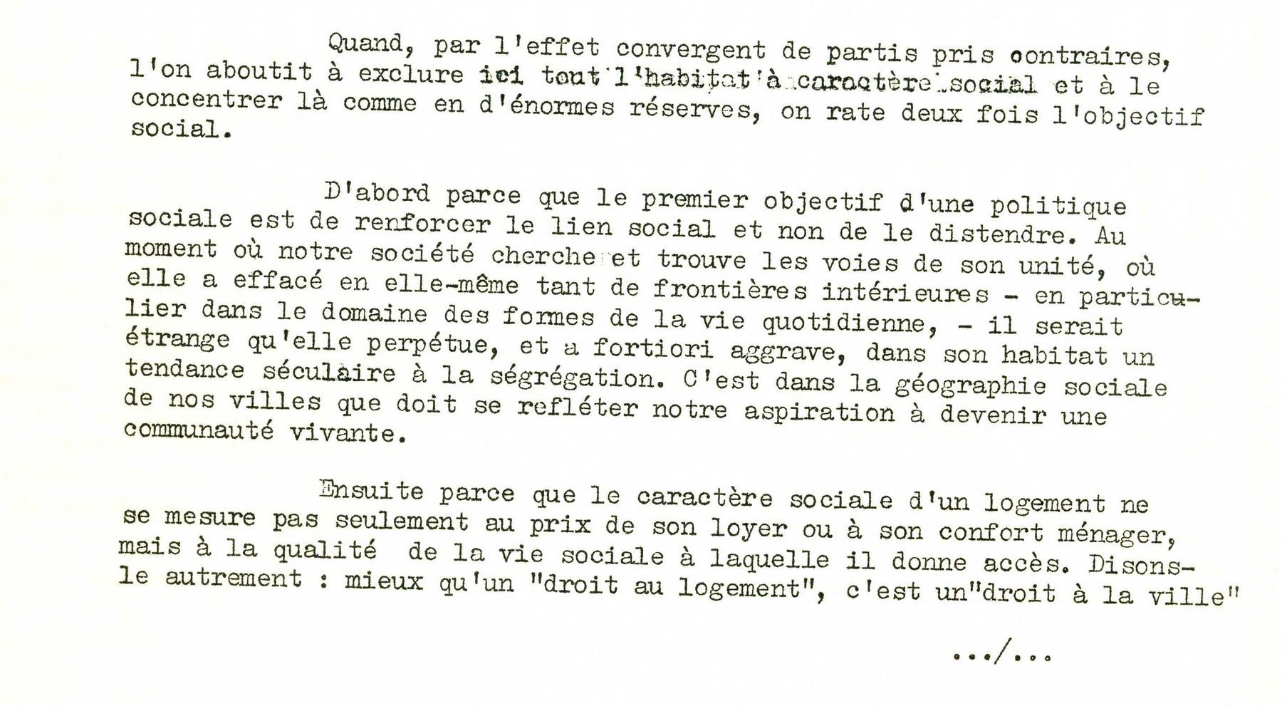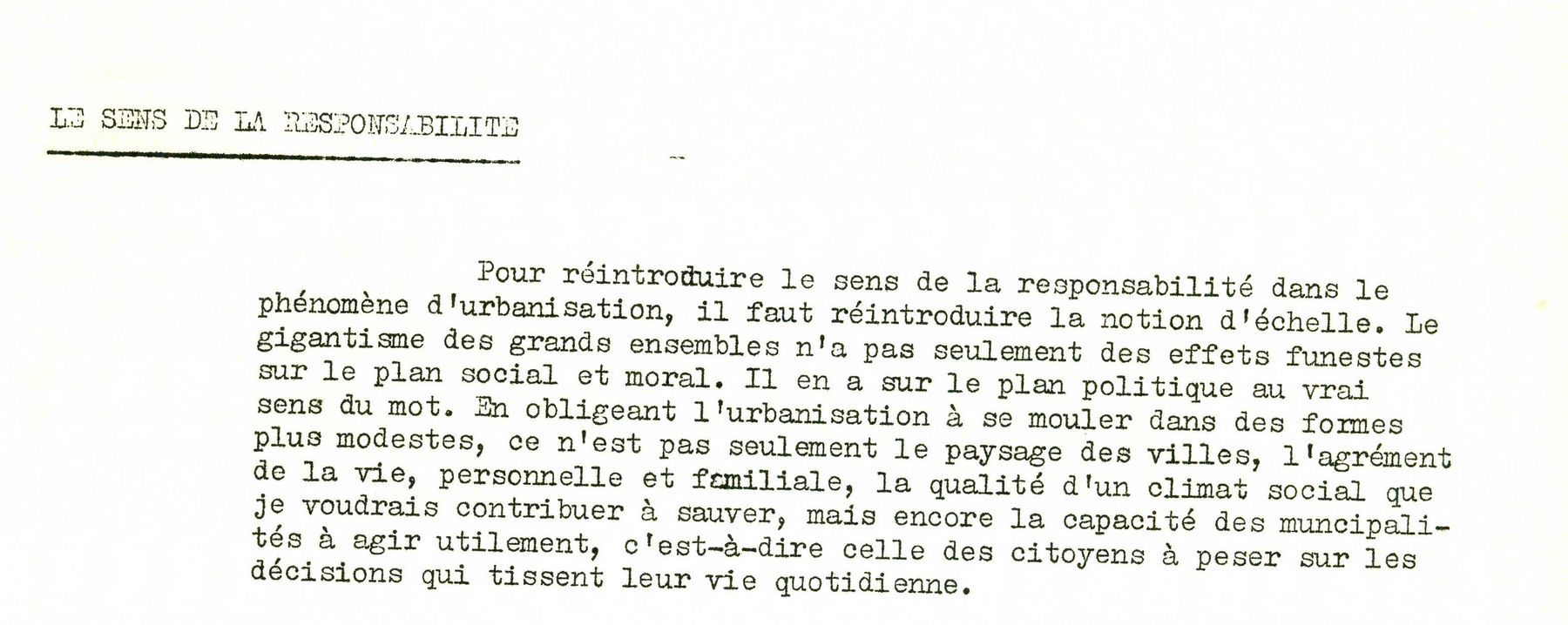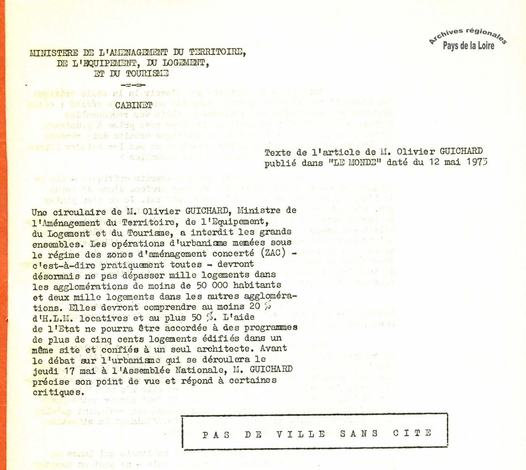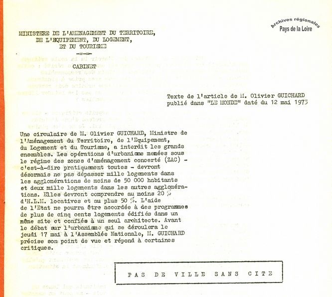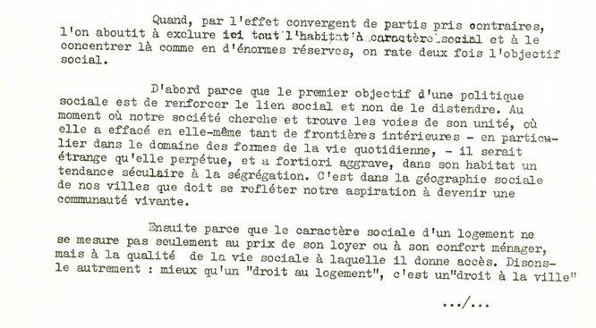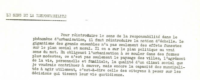 Parmi ces archives, le texte dactylographié « Pas de ville sans cité », reprenant un article paru dans Le Monde, a pour buts d’expliciter les intentions de la circulaire et de répondre aux critiques reçues.