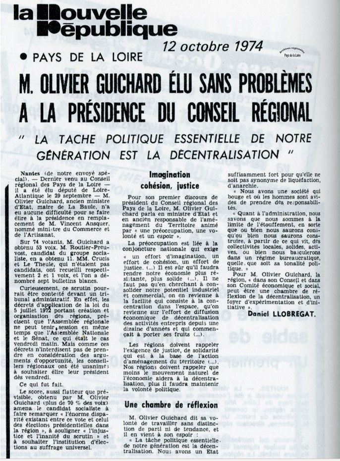 Olivier Guichard (1920-2004) aurait eu 100 ans cette année. Parmi ses nombreuses responsabilités nationales et locales, nous vous proposons de revenir sur sa première élection au Conseil régional des Pays de la Loire en octobre 1974.