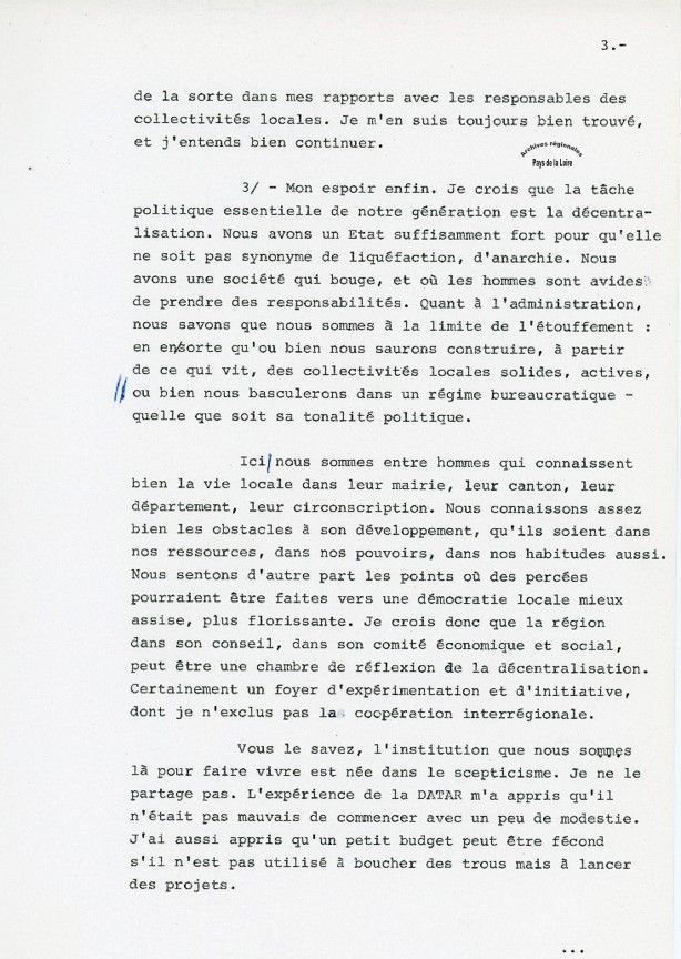 Fort de ses responsabilités nationales passées à la tête de la DATAR et du ministère de l’Aménagement du territoire, son discours évoque notamment l’enjeu de la décentralisation pour les territoires, en la qualifiant précisément d’ « espoir » et de « tâche essentielle pour notre génération » (partie 3 du discours ci-dessous)…